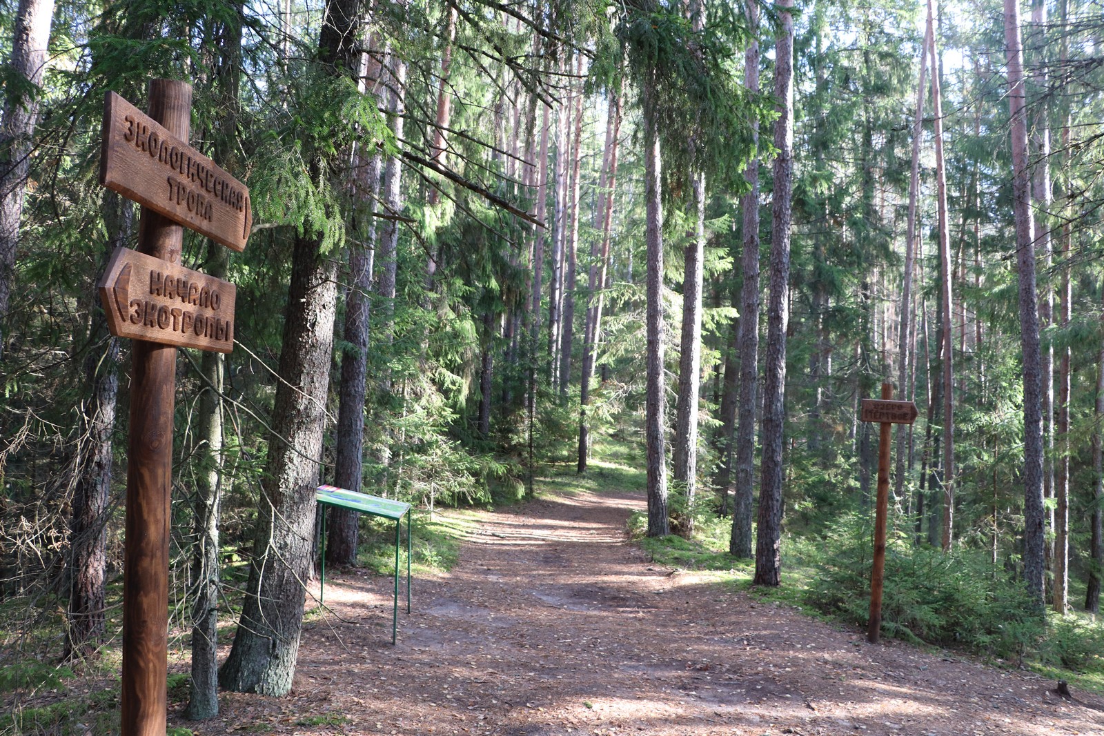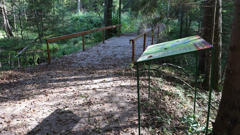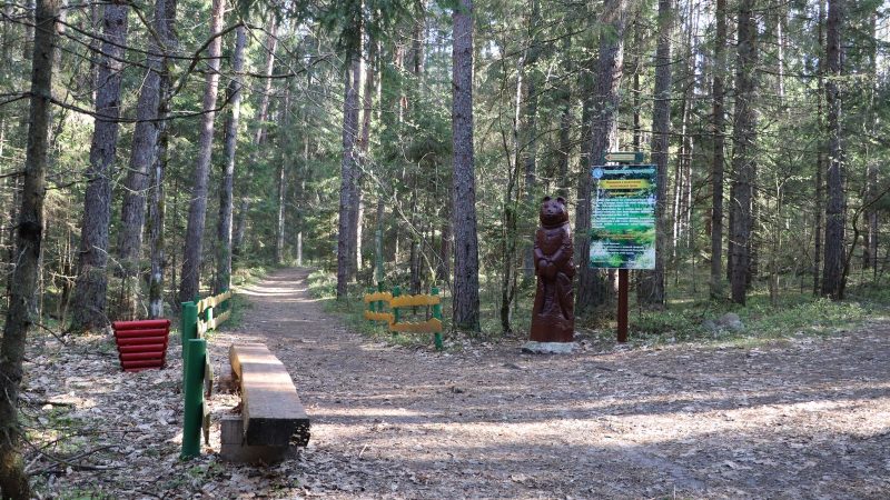 Протяженность маршрута 4 км и 7 км. Он проходит по сильно пересеченной местности: гребню озовой гряды, хвойному лесу, по берегам живописных озер, через реку Страчу и протоки, вдоль заболоченной местности. Большие площади светлых сосновых боров, смешанных лесов и угрюмых ельников приютили многих птиц и зверей, следы которых видны повсюду и создают впечатление загадочной волшебной сказки.